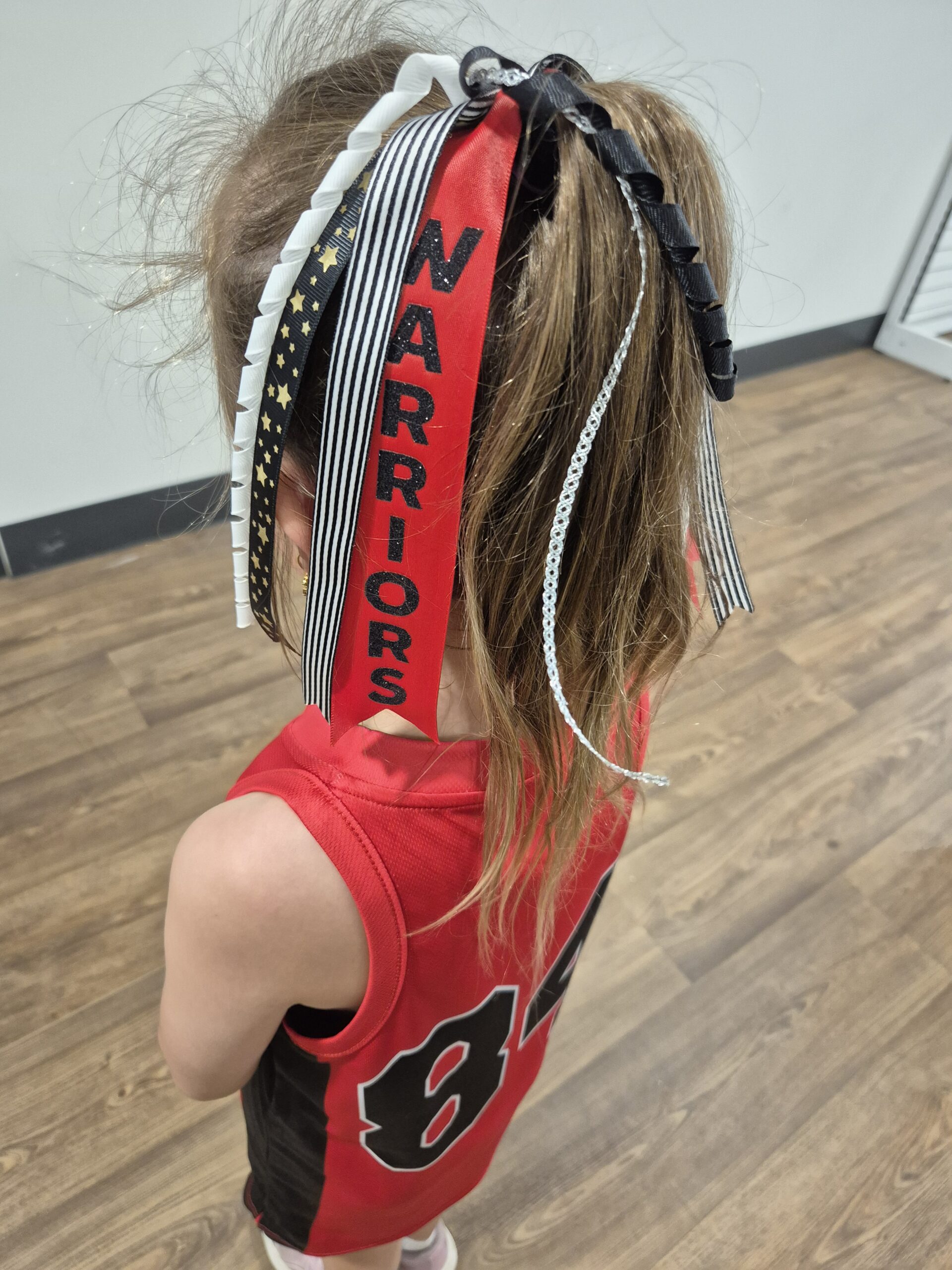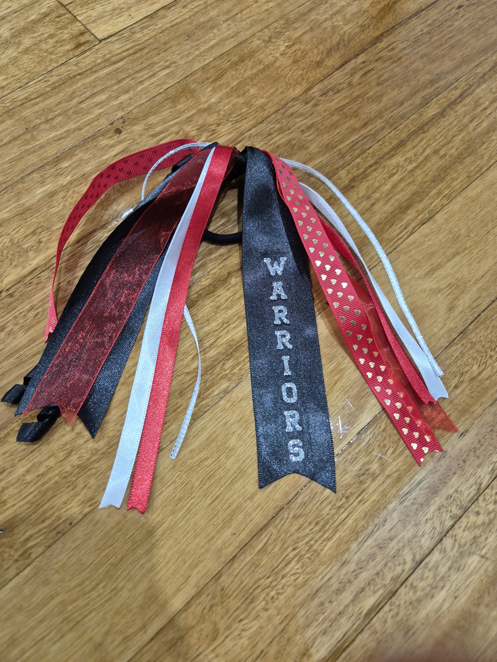 Made using different sized black, red and white ribbons, with the word Warriors in glitter vinyl on one side of the ribbon.